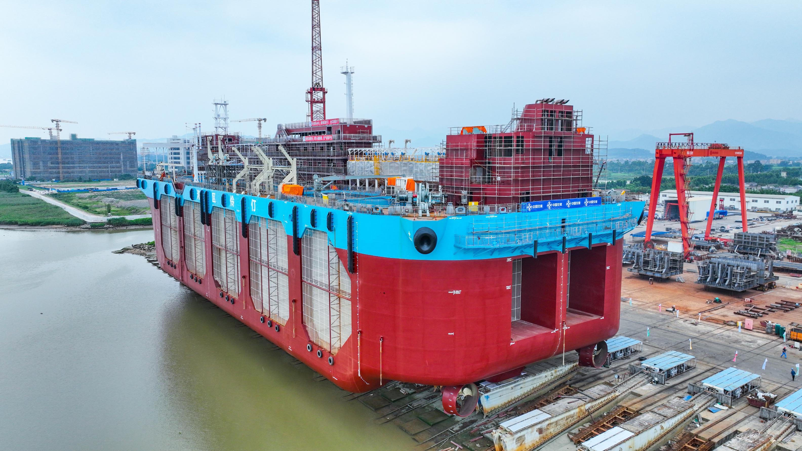 全球首艘水体自然交换型深远海养殖工船“湾区伶仃”号在广东江门航通船厂顺利下水。