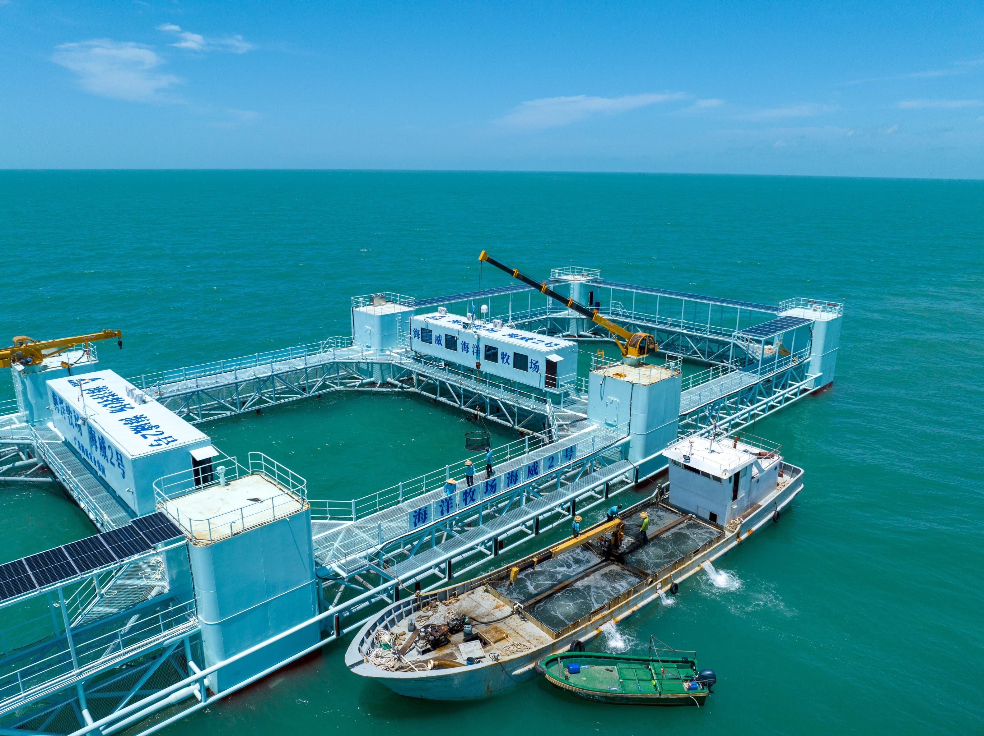 广东“蓝色粮仓”丰盈,图为“海威2号”首次投苗。