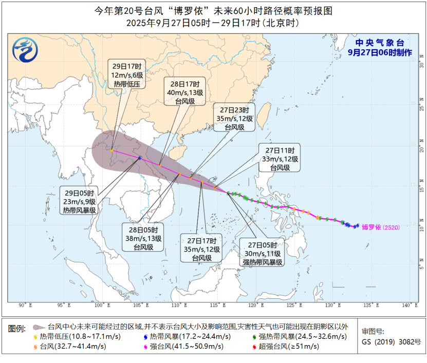 预计,“博罗依”将以每小时35公里左右的速度快速向西偏北方向移动,强度逐渐增强,逐渐向海南岛以南海面靠近,并将于28日白天掠过上述海面,最强可达台风级(35-40米/秒,12-13级),以后将于28日傍晚到夜间在越南中北部沿海登陆。